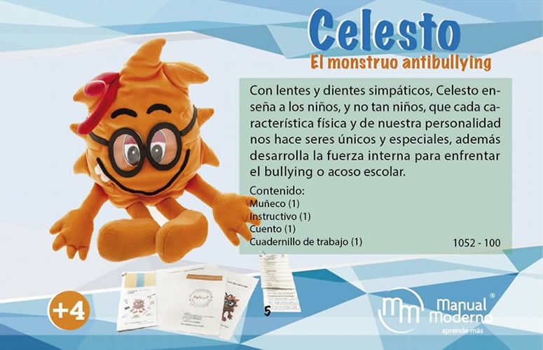 Con lentes y dientes simpáticos, Celesto enseña a los niños y no tan niños que cada característica física y de nuestra personalidad nos hace seres únicos y especiales con la fuerza interna para enfrentar el bullying o acoso escolar.- Uso individual y grupal.